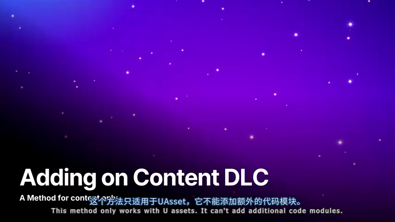限制说明: - DLC可以意味很多东西,这里只从**内容管理角度**来处理 - 这个方法只适用于UAssets,不能添加额外的代码模块(但通常这就够了)